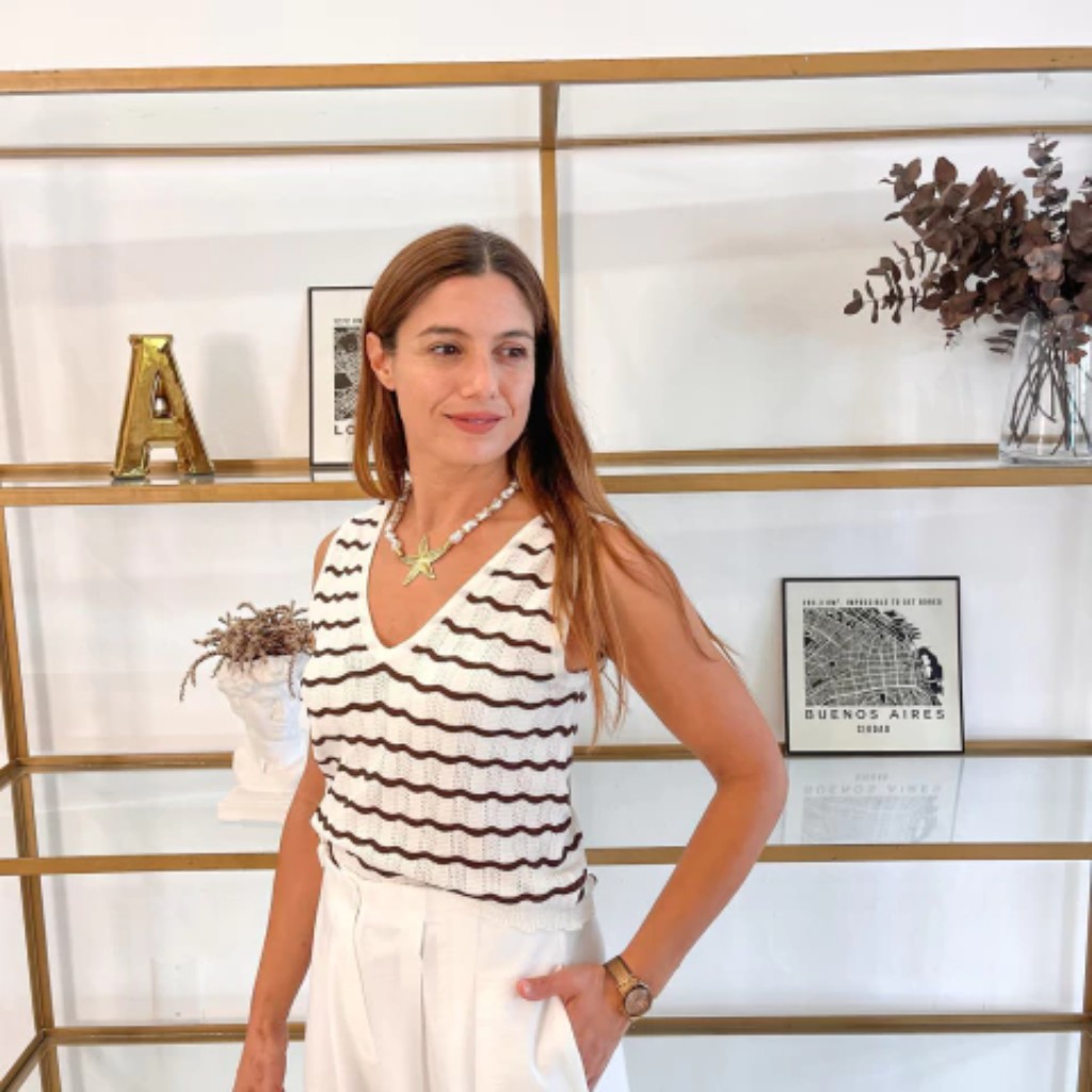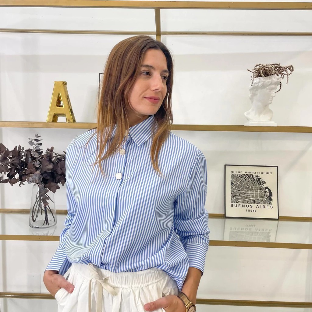 Entre las camisas, destaco una de mis preferidas que viene con botoncitos blancos con borde dorado y un detalle delicado en la bandita, que aporta sofisticación y estilo.