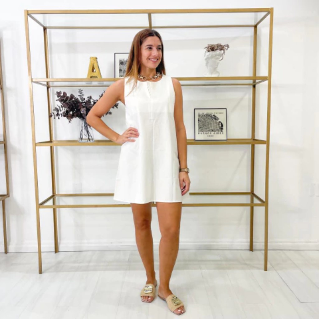 Otro favorito es el vestido de lino, que me encanta por su elegancia natural y los botoncitos escritos que le dan un toque especial.