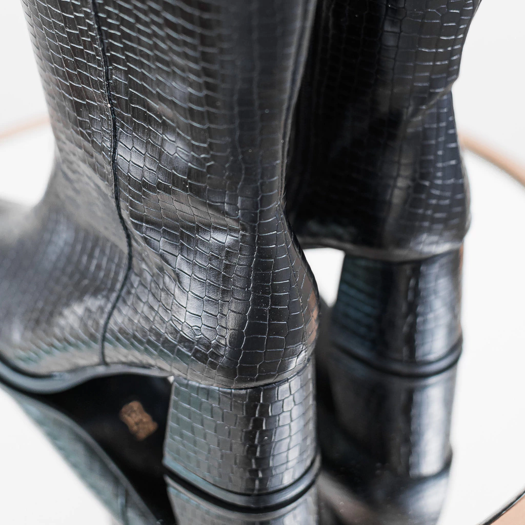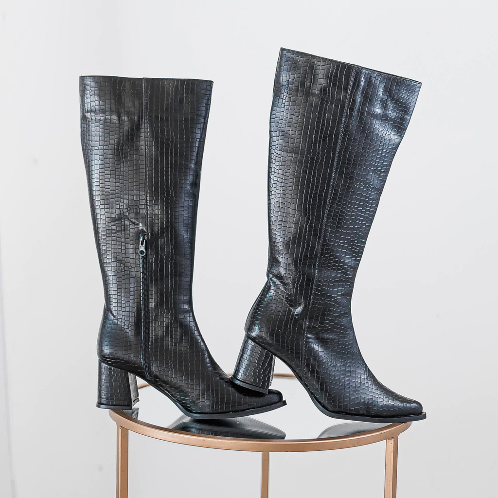CARACTERÍSTICAS Las Bota Lauryn Negro son la elección perfecta para aquellas mujeres que buscan estilo y elegancia. Con una caña alta de 37 cm y un taco de 6 cm, estas botas de eco cuero con textura croco aportan un toque sofisticado a cualquier outfit. Su diseño moderno se adapta a diferentes ocasiones, garantizando confort y un look impecable.