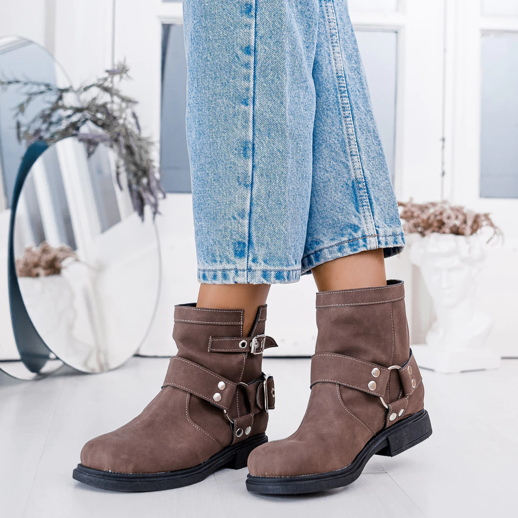 Botas caña corta de eco cuero color suela con hebillas. La caña mide 14,5 cm y la suela mide 3 cm