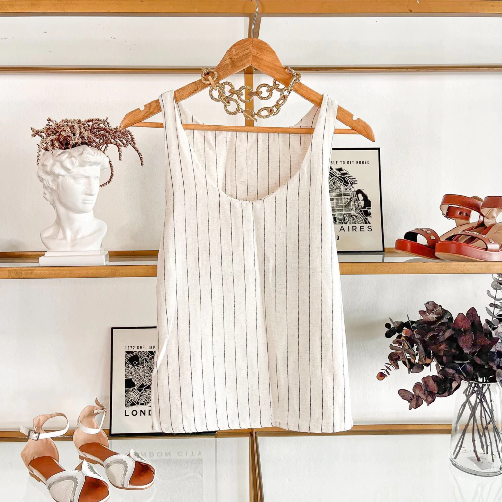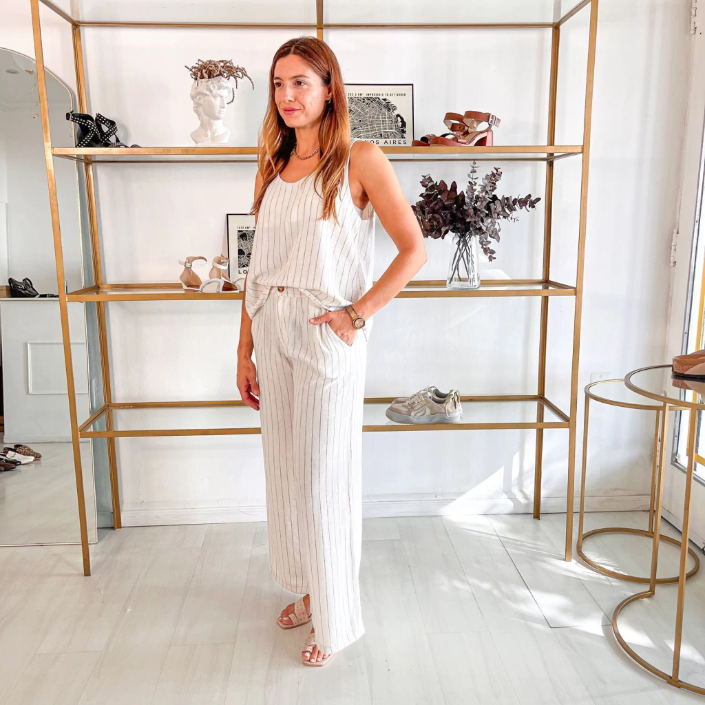 CONJUNTO DE LINO NEDA Descubrí la elegancia natural con nuestro conjunto de lino color natural, decorado con finas rayas negras que aportan un toque sofisticado y moderno. Este conjunto es ideal para quienes buscan comodidad y estilo en cada ocasión.