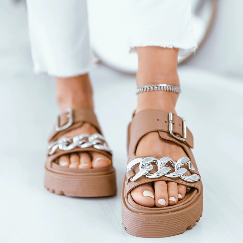 Sandalia de eco cuero color suela con cadena de plástico lo que las hace muy livianas color plateada. La base de expanso mide 4 cm entre la platilla y la suela.