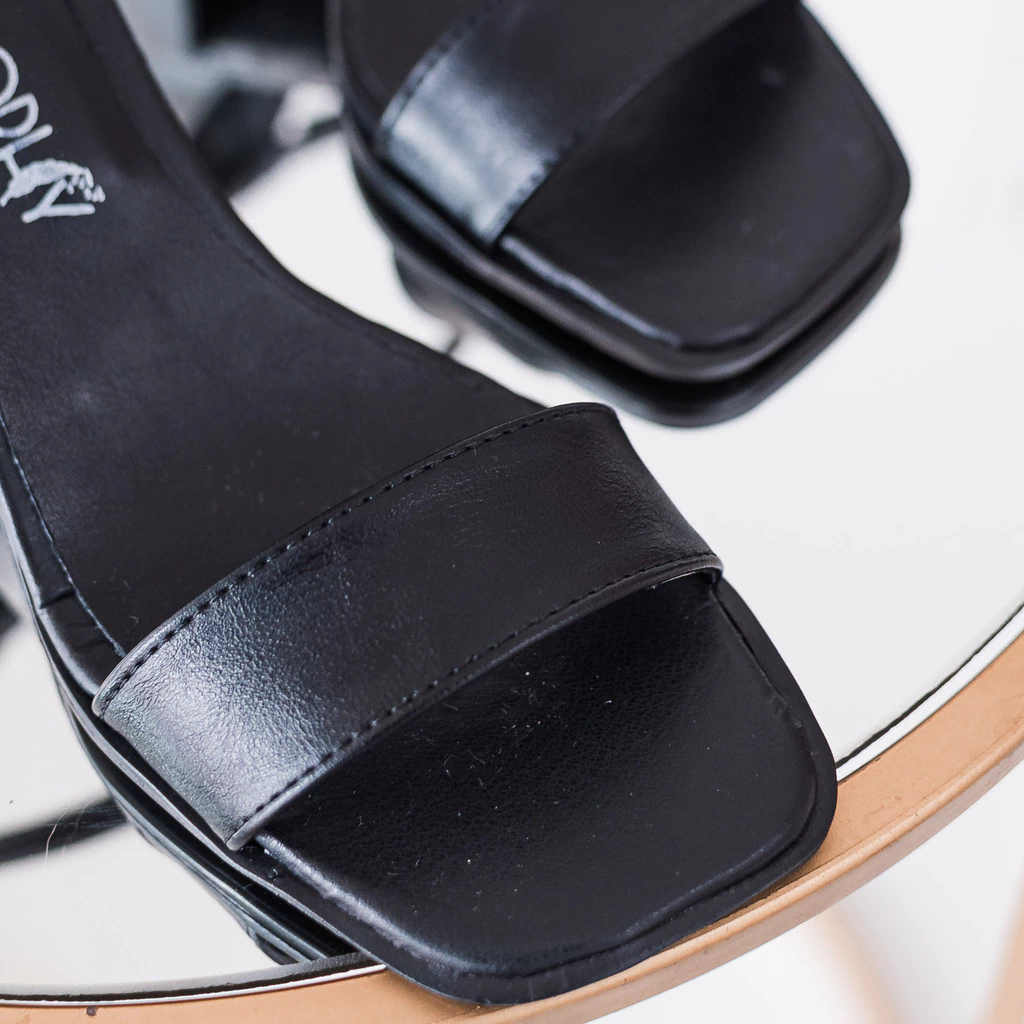 Sandalia de eco cuero color negro con puntera cuadrada y tira para ajustar alrededor del tobillo. El taco está forrado con el mismo cuero y mide 5 cm de alto.