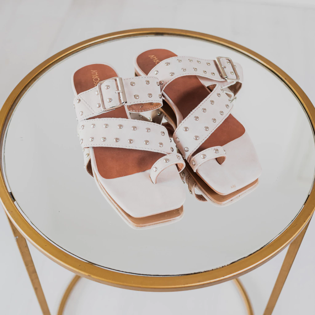 Elegí comodidad y estilo con esta sandalia baja de mujer, fabricada en eco cuero color natural. Su diseño moderno incluye delicadas tachas que le dan un toque único y sofisticado.