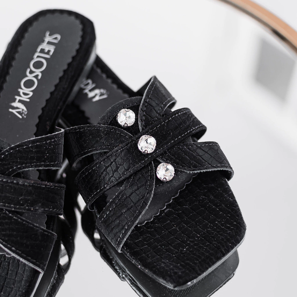 La Sandalia Aurora está confeccionada en un elegante croco chico en color negro, que aporta un toque sofisticado a cualquier atuendo. Sus apliques de strass brillan añaden un detalle encantador. Además, su diseño bajo garantiza comodidad y estilo durante todo el día.