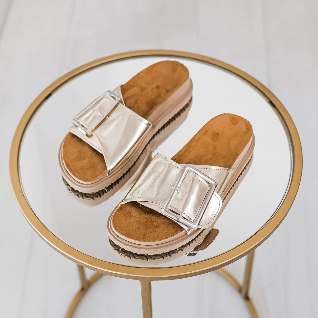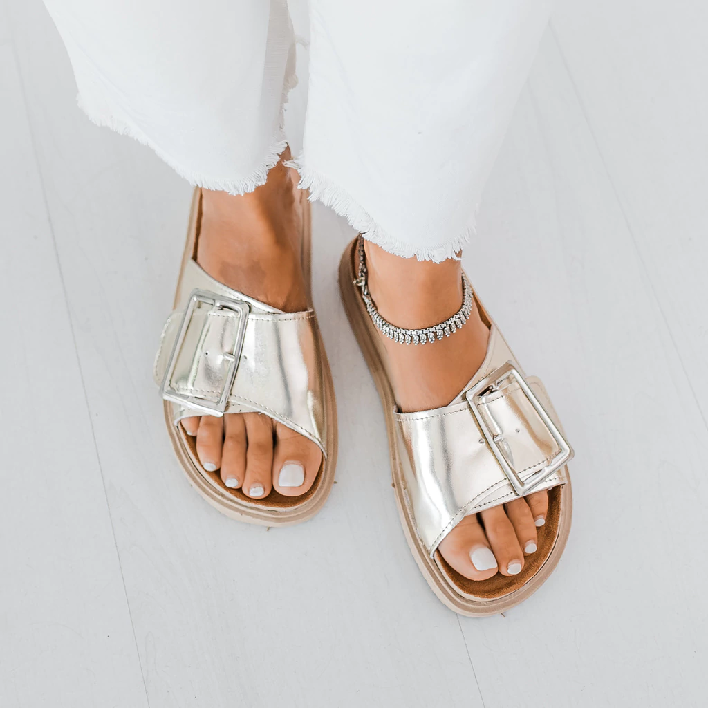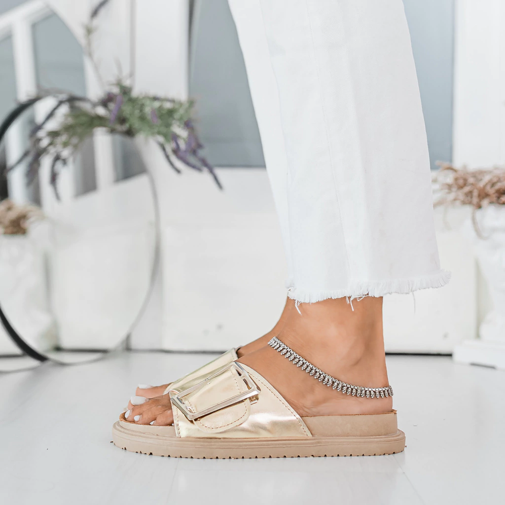 Las Sandalias Giovi oro son la elección perfecta para aquellas que buscan comodidad y estilo en cada paso. Confeccionadas en eco cuero color oro estas sandalias livianas cuentan con una suela de goma EVA que ofrece gran flexibilidad. Su plantilla forrada en gamuza proporciona un confort excepcional, mientras que la hebilla grande añade un toque moderno y chic.
