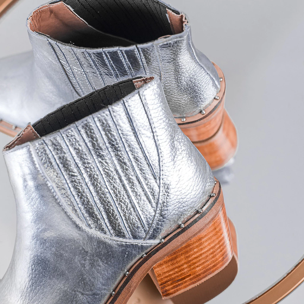 Texana de cuero color plata con taco de folia, puntera metálica y vira de tachas plateadas.