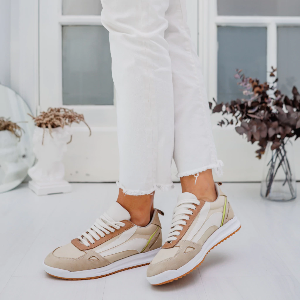 Descubrí la combinación perfecta entre estilo y comodidad con esta zapatilla de mujer confeccionada en lona color arena, realzada con detalles en cuero en tono lima. Su diseño fresco y versátil es ideal para cualquier ocasión, aportando un toque único y moderno a tus looks diarios.