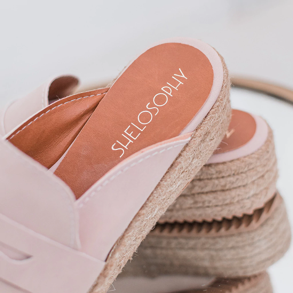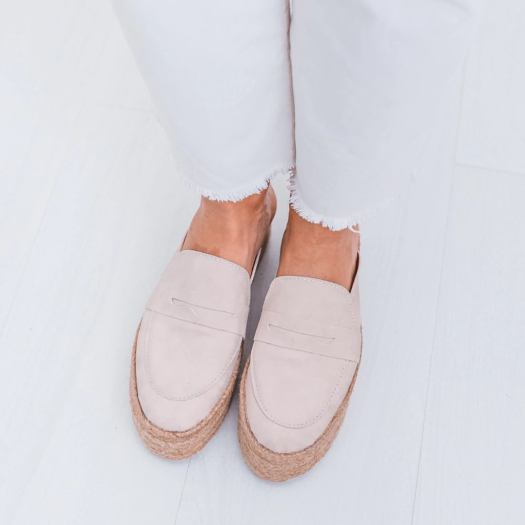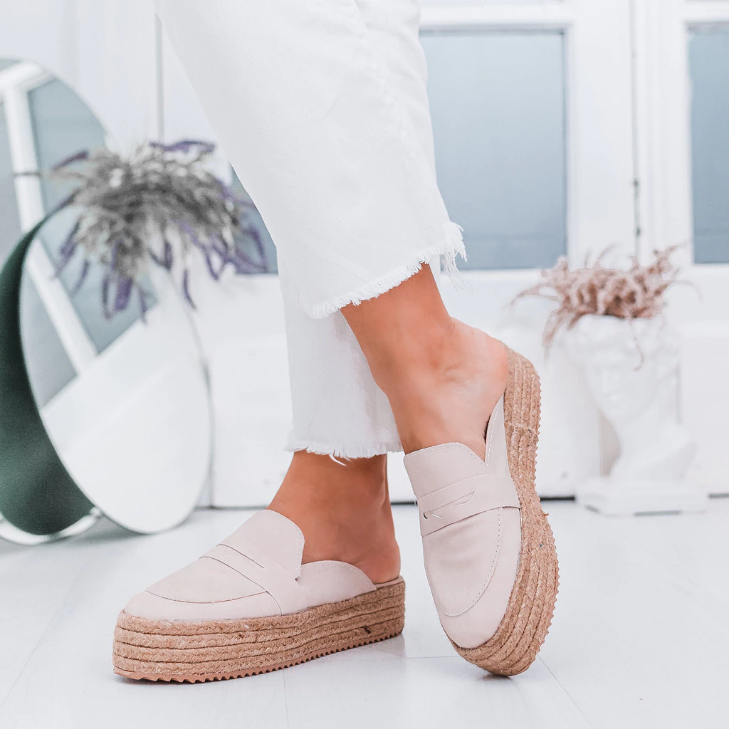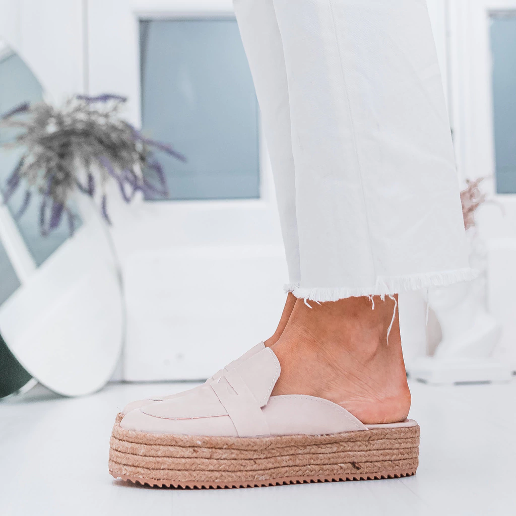 El zueco TINA está confeccionado en eco cuero color natural con plataforma de yute muy liviana de 4 cm